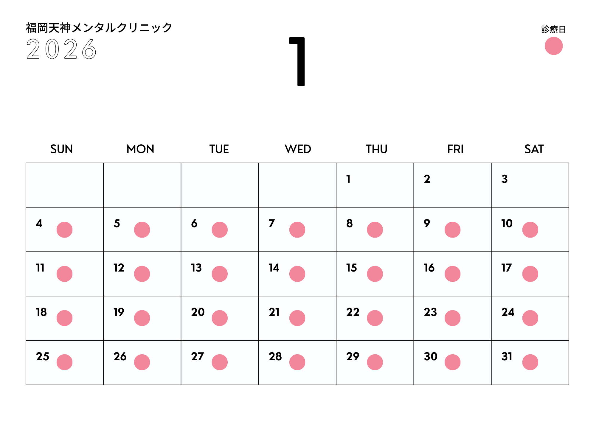 平素より当院をご愛顧いただき、誠にありがとうございます。 2026年1月の診療日について、ご案内申し上げます。 ←2025年12月の診療日はこちら ■診療時間 10:00~14:00、15:30~20:00 ■休診日 1月1日(木)、1月2日(金)、1月3日(土) ■診療日 上記休診日を除く、月曜日から日曜日まで、休まず通常通り診療いたします。 休診日をご確認の上、お間違えのないようご来院ください。 どうぞよろしくお願いいたします。 24時間受付中 WEB予約